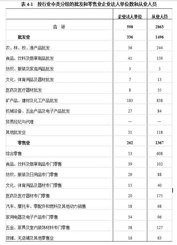 2023年末,全县共有批发和零售业企业法人单位 个,从业人员2863人,分别比2018年末增长2.04%和23.24%。