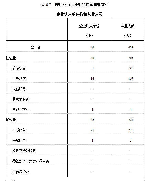 2023年末,全县共有住宿和餐饮业企业法人单位46个,比2018年末下降2.12%;从业人员434人,比2018年末下降6.87%。