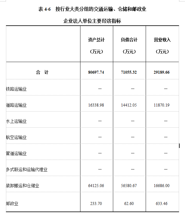 2023年末,交通运输、仓储和邮政业企业法人单位资产总计80697.74万元,比2018年末增长103.48%;负债合计71055.32万元,比2018年末增长122.06%。