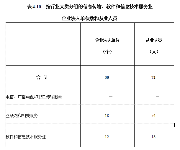 2023年末,全县共有信息传输、软件和信息技术服务业企业法人单位30个,从业人员72人,分别比2018年末下降46.43%和50.34%(详见表4-10)。