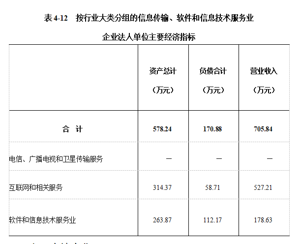 2023年末,信息传输、软件和信息技术服务业企业法人单位资产总计578.24万元,比2018年末下降85.03%;负债合计170.88万元,比2018年末下降66.65%。
