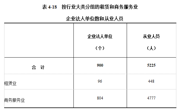 在租赁和商务服务业企业法人单位中,租赁业占10.60%,商务服务业占89.40%。在租赁和商务服务业企业法人单位从业人员中,租赁业占8.53%,商务服务业占91.47%(详见表4-18)