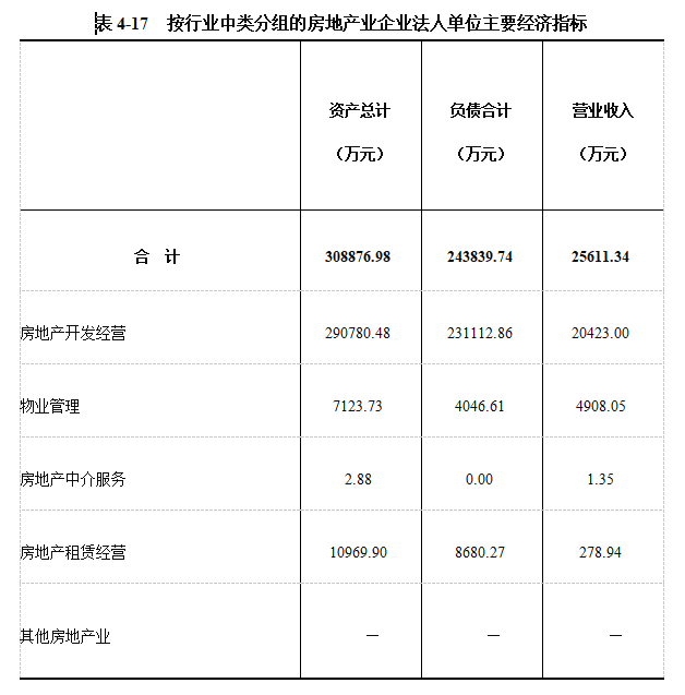2023年末,全县房地产业企业法人单位资产总计308876.98万元,比2018年末增长89.29%。其中,房地产开发经营企业290780.48万元,物业管理企业7123.73万元,房地产中介服务企业2.88万元,分别比2018年末增长96.24%、增长19.44%和下降92.39%。房地产业企业法人单位负债合计228082.87万元,比2018年末增长98.95%。