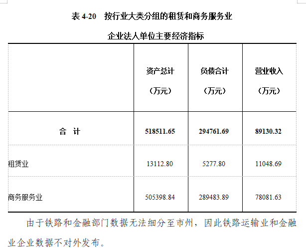 2023年末,租赁和商务服务业企业法人单位资产总计518511.65万元,比2018年末增长45.29%。其中,租赁业企业法人单位资产总计13112.80万元,商务服务业企业法人单位资产总计505398.84万元,分别比2018年末增长174.09%和43.57%。租赁和商务服务业企业法人单位负债合计294761.69万元,比2018年末增长14.57%。