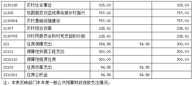 2024年度一般公共预算财政拨款支出2466.04万元,主要用于以下方面:一般公共服务支出642.48万元,占26.05%;外文化旅游体育与传媒支出2.00万元,占0.08%;社会保障和就业支出80.67万元,占3.27%;卫生健康支出38.10万元,占1.54%;节能环保支出37.83万元,占1.53%农林水支出1310.41万元,占53.14%;住房保障支出354.56万元,占14.38%.