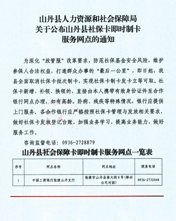 关于公布山丹县社保卡即时制卡服务网点的通知