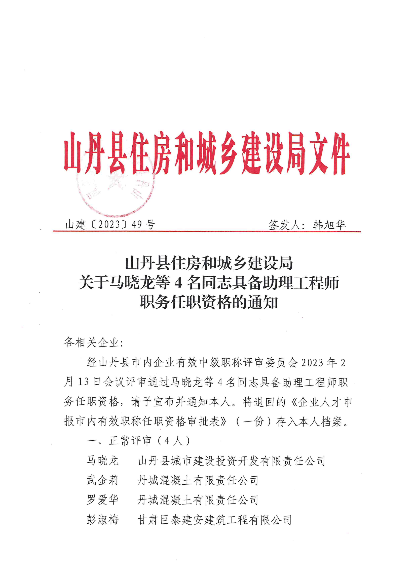 关于马晓龙等4名同志具备助理工程师职务任职资格的通知