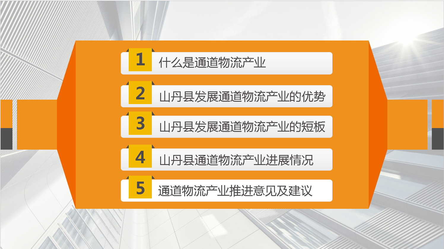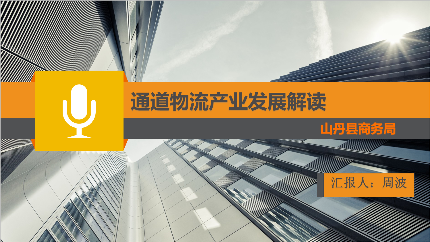 本课件从五个方面介绍了全县通道物流产业发展情况,分别是什么是通道物流产业,我县发展通道物流产业的优势,我县发展通道物流产业的短板,我县通道物流产业进展情况,我县通道物流产业推进意见及建议。
