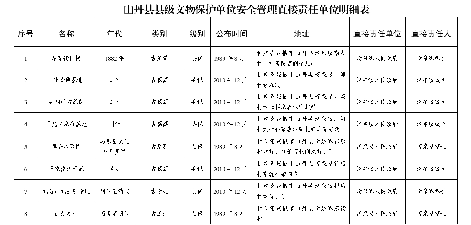 理办法的通知》(甘政办发〔2018〕10号)、省文物局《关于印发甘肃省不可移动文物安全直接责任制实施办法》(甘文局安发〔2022〕8号)文件精神,认真贯彻落实“保护第一、加强管理、挖掘价值、有效利用、让文物活起来”的新时代文物工作方针和“三管三必须”要求,按照“属地、就近、完整、在用”原则,实行文物安全责任单位公示公告。经县政府研究同意,现将山丹县150处(国保1处、省保8处、县保78处、一般文物点63处)不可移动文物安全管理直接责任单位予以公布。