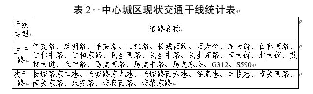 根据《中心城区道路交通规划图》,依据《声环境功能区划分技术规范》(GB/T 15190-2014)相关规定,将分布于中心城区内的城市主干路、城市次干路及其红线两侧一定距离内的区域统一划定为4a类区。中心城区现状交通干线见表2。