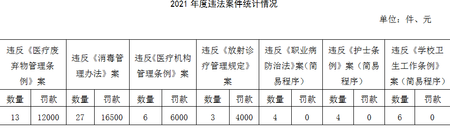 【监督执法办案】 强化卫生监督执法职能,落实行政执法责任制,加大卫生监督各专业领域违法行为的查处力度。年内查处卫生行政执法案件75件、结案75件、处罚金额54000元,其中公共场所12件、职业卫生3件、医疗卫生58件、消毒产品2件、一般程序59件、简易程序16件。