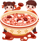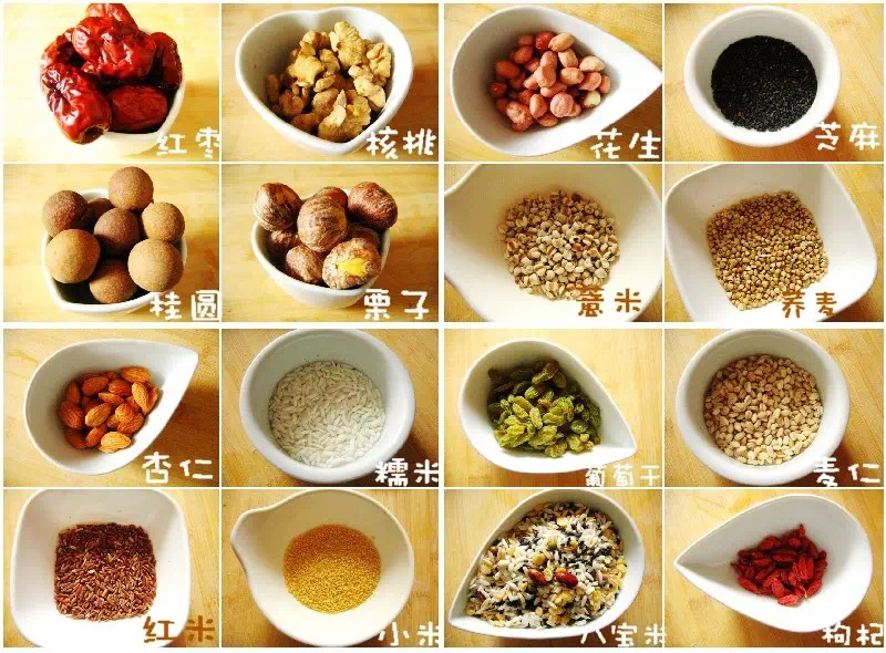 《燕京岁时记》中记载:“腊八粥者,用黄米、白米、江米、小米、菱角米、栗子、红豇豆、去皮枣泥等,合水煮熟,外用染红桃仁、杏仁、瓜子、花生、榛穰、松子及白糖、红糖、琐琐葡萄,以作点染。”