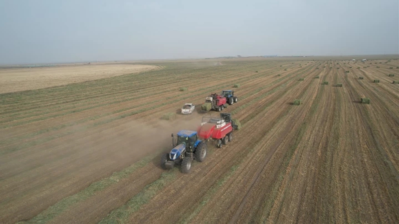 据介绍,得益于今年雨水丰沛的自然条件,燕麦草平均亩产较去年增加200公斤。冷凉气候和长日照有利于燕麦草糖分、蛋白质积累,市场价格每吨也高出200余元。在收割环节还创新应用了一项“碾压”技术,有效保护叶片完整性并对茎秆进行折弯与挤压,破坏其表面的蜡质层,使得茎、叶干燥同步,极大优化了后续打捆与储运流程。